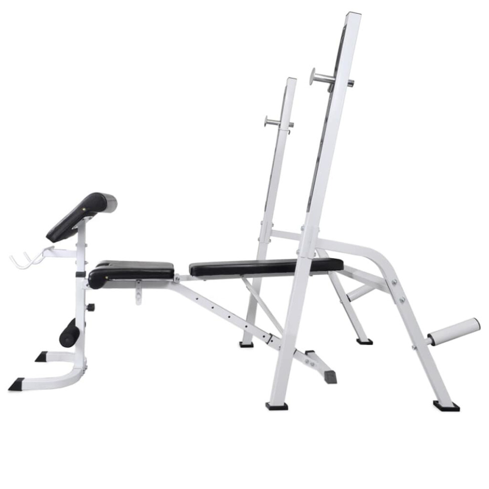 This adjustable workout bench with a weight rack and barbell and dumbbell set will be a great choice for working out in the comfort of your own home, and saves you the hassle and expense of going to a gym. This workout bench provides a wide range of exercise options. The backrest will strengthen your back muscles. Thanks to the arm curl cushion, arms can be exercised. The wide range of workout combinations and exercises allows for an effective, total body workout, while the adjustable levels enable the workout to be adapted to suit your specific needs. The sturdy steel construction of the bench ensures your safety during the exercises. The durable cotton-padded cushion will offer you the utmost comfort. The barbell and dumbbell set features solid chrome-plated bars with quick-action spring collars (for barbell bar), non-slip knurled grips, and fluted star-screw caps (for dumbbell bars) for secure attachment of the weight plates. You can work out without worrying about safety issues. The weight plates are made with a robust polyethylene casing. They can be combined in various ways for different training purposes. Delivery includes a workout bench, a barbell bar, two dumbbell bars, six 1.25 kg weight plates, four 2.5 kg weight plates, four 5 kg weight plates, two 10 kg weight plates, four caps and two spring collars.